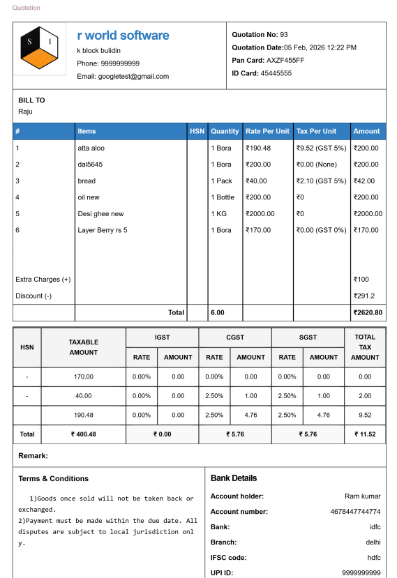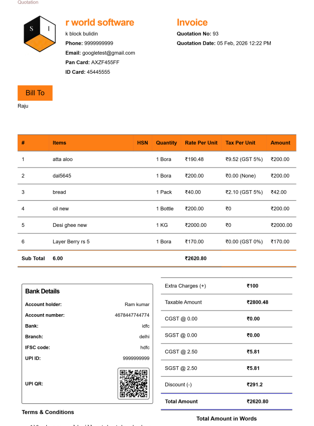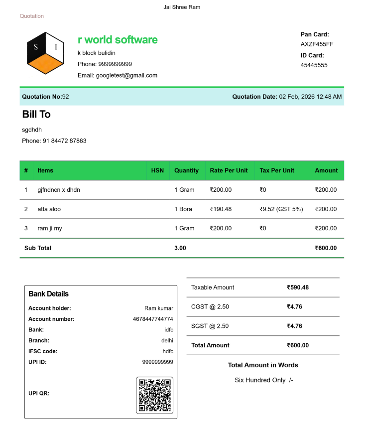 Easily create professional quotations using advanced quotation software. Add complete business details including business name, address, mobile number, GST number, and company logo. Enter customer details such as name, address, and contact number. Add product or service information like item name, quantity, price, discount, and GST automatically.